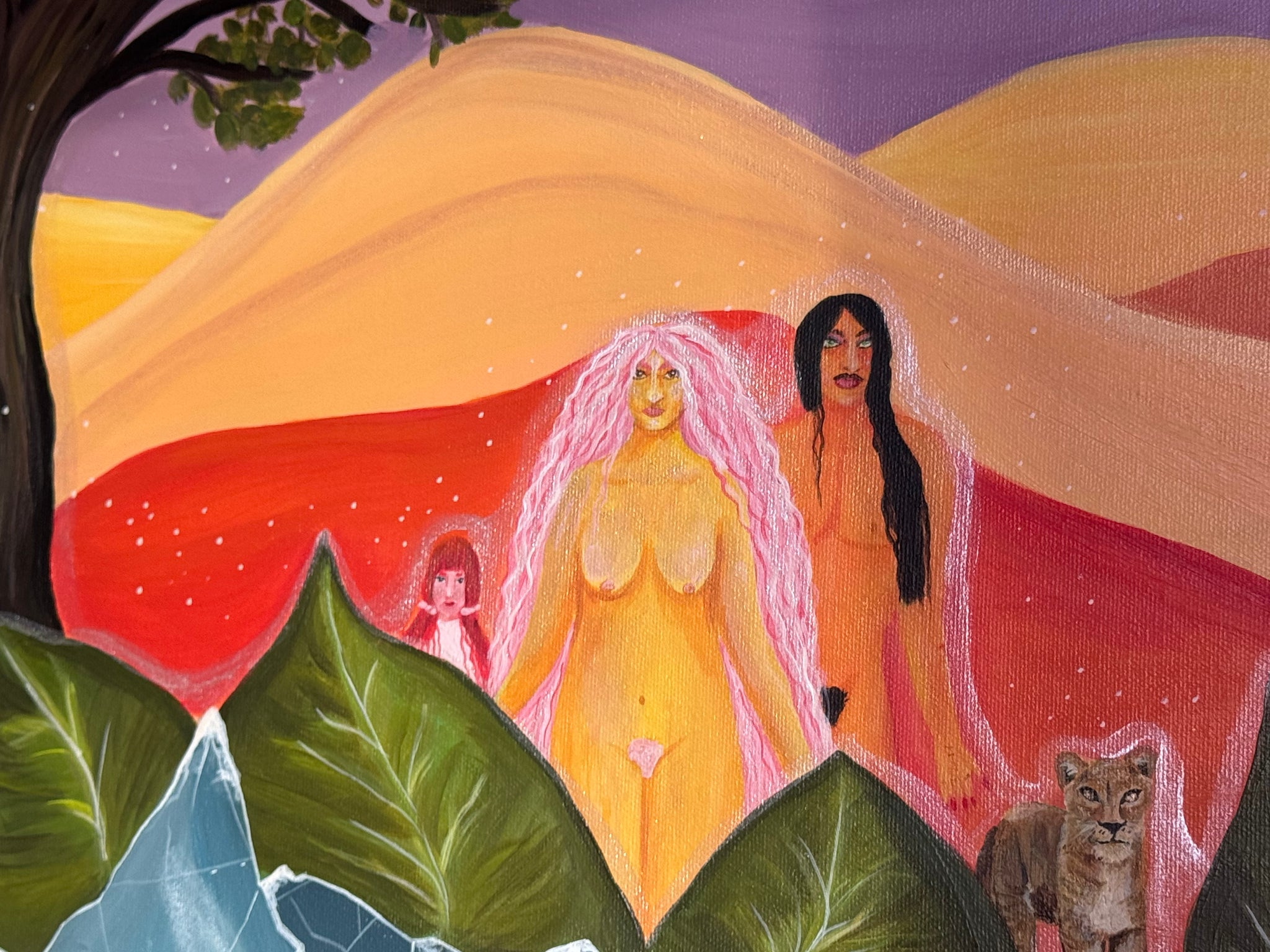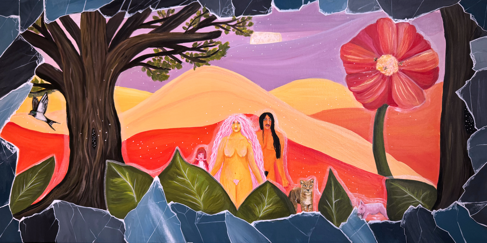This piece represents a breaking point where our humanity, animals  & Earth take their power back, destroying the artificial intelligence screens. This is a rejection of the AI, which dangerously claims to make our lives easier by truly isolating us,  to reconnect with the deep essentials of life : connections, culture, love & nature. These protagonists are rising up with their humanity, reclaiming a natural cyclical world that has been destroyed through centuries of capitalism & imperialism. The woman is leading the way through her vision of equality, empathy and innovation to reconnect with our roots and soul. The queer man represents a healthy and feminist masculinity, with a girl on the side, representing the next generations.